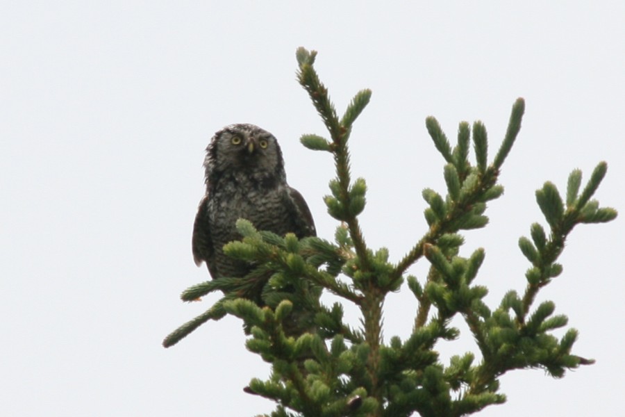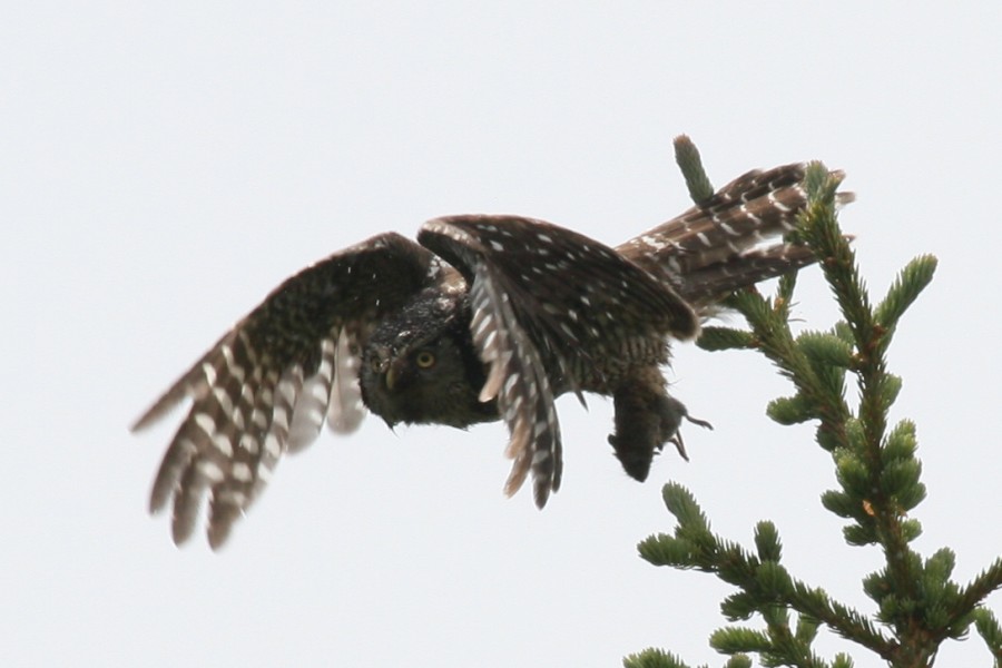 While driving along Alaska's beautiful Richardson Highway, I noticed what I thought was a peregrine falcon, flying low and parallel to the road. Well, almost parallel, as we soon found our courses converging, until the bird's brown-streaked wings side-swiped my passenger window! The bird landed on the nearest perch to collect itself, while I slammed on the brakes, sat in the middle of the shoulderless highway (near a dangerous bend) and managed to snap a couple shots before the bird took off. A few days later, as I sat at the airport scrolling through the pictures I'd taken on this trip, I scratched my head when I came across two shots of an owl. Where did these come from? It was only then that I realized that the side-swipe encounter was not with a peregrine, but a northern hawk-owl! As a bonus, the picture also showed that it was carrying a nice little snack. In retrospect, I guess it made sense that the owl, with its poor peripheral vision, would not have noticed my approach from behind. |